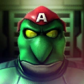 The Attack Carrier's Captain is a green lizard, with yellow eyes and a pointed snout. He wears segmented shoulder pads and a red bandanna with the insignia of Andross printed on the crown.