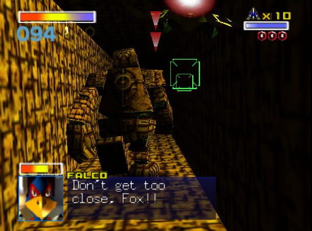 The Star Fox Team encountered Golemech at the temple just ahead of Andross's Palace, where the rocky titan acted as the final line of defense. Slippy Toad didn't understand what the giant was running away for if it were to be the last defense, as well as Falco warning Fox not to get too close. The escape was a distraction since Golemech was altering the tunnel behind it to try and lead the Arwing into hazardous obstacles to crash into, but the giant was not able to prevent the small, quick squadron of starfighters from peeling away its hull with laser fire until the sensitive core was exposed which destroyed Golemech and allowed Star Fox to continue reaching the Ape Emperor.