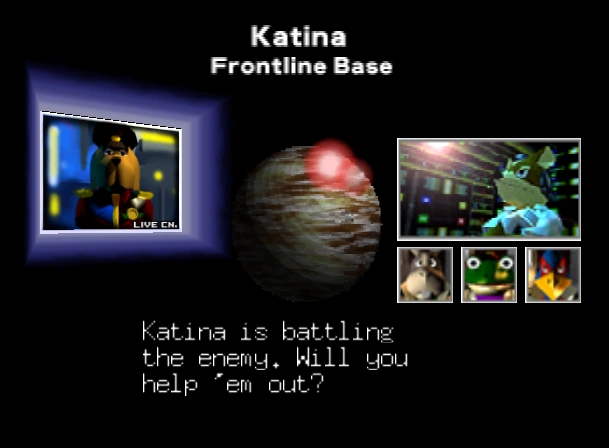 - “Katina is one of Corneria's front line defense posts, and it's being overrun by Andross's fighters. A distress call was received from Fox McCloud's academy classmates, Bill Gray, who is in command of Husky Squadron. Apparently there are hundreds of fighters swarming over the base! Bill has also informed Cornerian Command that an enemy mother ship has been detected on its way to the planet. Husky Squadron will need the Star Fox Team's help to deal with this gigantic threat. Bill will brief you more fully on the gargantuan mother ship when you get there, so listen to him carefully!”