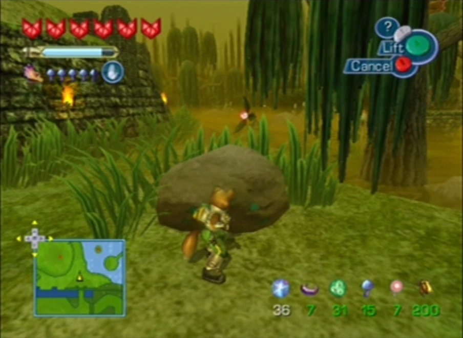 In order to get the Scarabs out from under a rock, Fox McCloud must use Krystal's staff as a lever to lift it up. The player does this by manoeuvering Fox so that he stands in front of a crevice on the underside of the rock marked by six green arrows painted onto it. An "A" button icon appears above the area. When the player presses it, Fox crouches down and slides the staff under the rock.