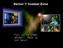 Sector Y can only be approached from Corneria after defeating the Attack Carrier. It is impossible to reach this sector without Falco being active, because he was the one to find the Attack Carrier. A battle is occurring in Sector Y and General Pepper asks Star Fox to win it. The space zone is crawling with Andross's intergalactic warships, accompanied by support air forces, artillery and the Androssian Fleet's biggest menace; fast flying robots that are overwhelming the Cornerian Fleet. The objective is to back up the Cornerian Fleet by trying to rack up 100 Hit points so that the following flight route will travel to the Aquas Ocean, if not, the path will only go to Katina.
