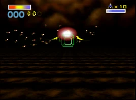 Whilst the Arwing's hull is built to withstand temperatures in excess of 9,000 degrees, the conditions will slowly eat up the shields from any distance, but will not destroy the Arwing. Flying close to the surface will drastically drain the shields while flying higher will deplete them at a moderate rate. Shooting the lava rocks and enemies will recycle their remains into Supply Rings. These important provisions are especially needed here to navigate the treacherous swells gathering on Solar's hot horizon. Dangerous curved plumes of hot gas and tidal lava waves make a straight and narrow path on this planet impossible, necessitating tilts and turns to avoid having the shields eaten up. Even though flying low drains shields, quickly dipping down to avoid a hazard can save shields in the long run. Smart Bombs can be used to clear a path through the fiery plumes, but no points are earned for dissolving them. Flocks of flaming bioweapons attack any Arwing that gets too close to their feeding grounds, behaving like moths drawn to flames as they home in on the ship.