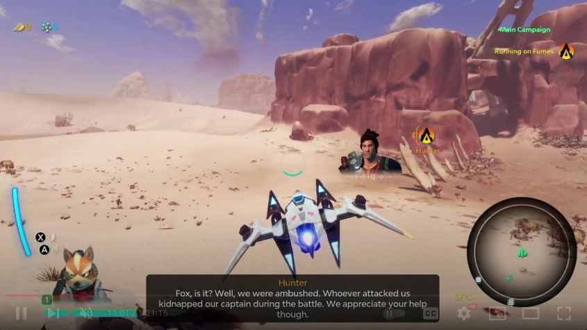 Gameplay screenshot of the Nintendo Switch version, showing Fox in his Arwing listening to Hunter Hakka